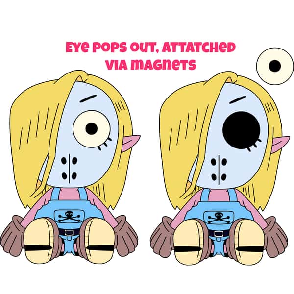 Geiko from Punch Punch Forever! Im 9 inch plush form. This little serial killer-in-training has the function to pop out her eyeball like its nothing, just like what happens during her fight with Gogo
