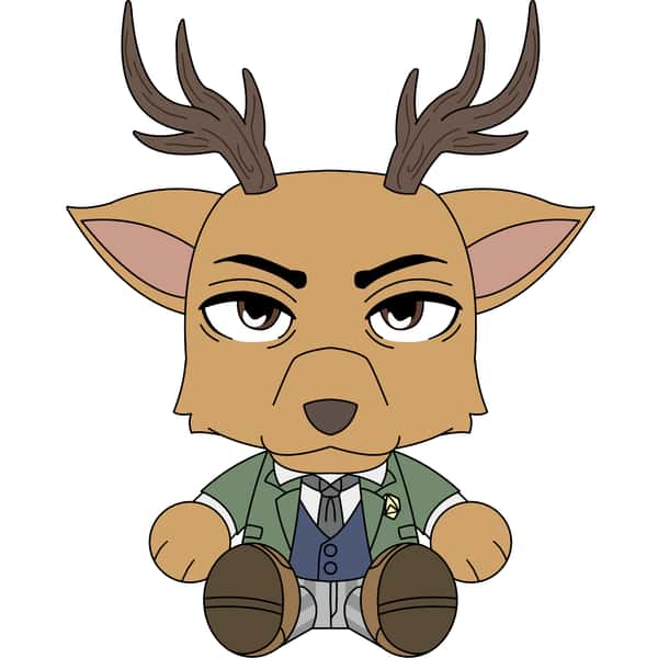 Louis makes his Youtooz debut as a plush! He has large brown antlers, and he is wearing his school uniform, consisting of a green jacket, blue best, and striped pants.