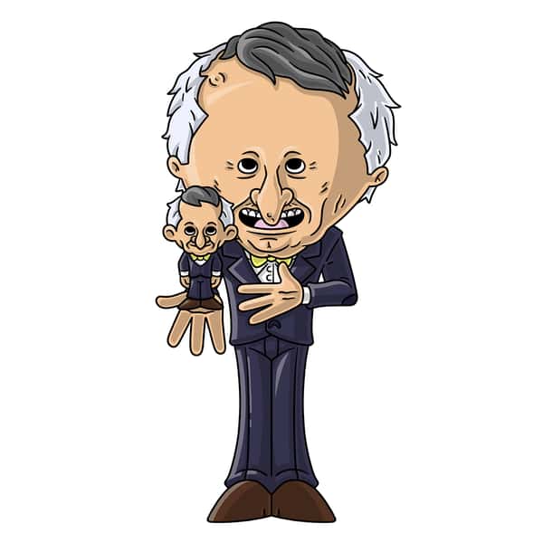 Your favorite boss has a little trick up his sleeve! A smaller Mr Boss! With beady black eyes staring forward above a crooked nose as grey hair sweeps to the side over wrinkled skin, he wears a dark blue suit and yellow bowtie as his right hand covers his chest and the left stretches forward with a smaller Boss in his open hand.