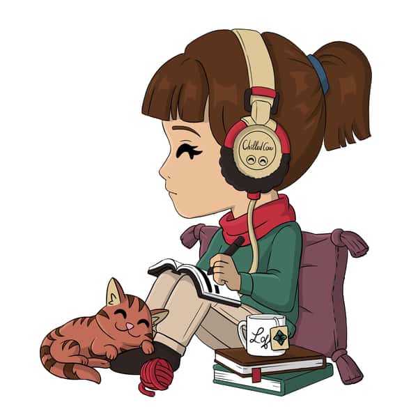 Time for another study session! Propped up with her back against a mauve pillows as she writes in the textbook that rests on her bent knees, she stares forward and wears beige headphones and a red and green sweater as an adorable striped cat snoozes on her feet and a cup of tea rests ready to her side.