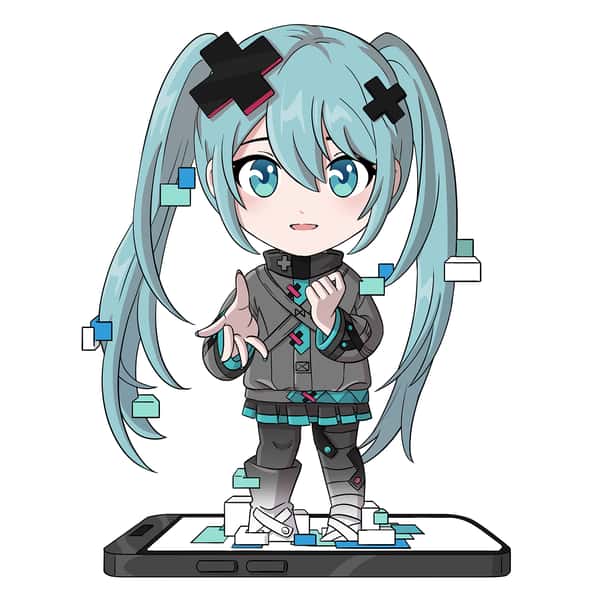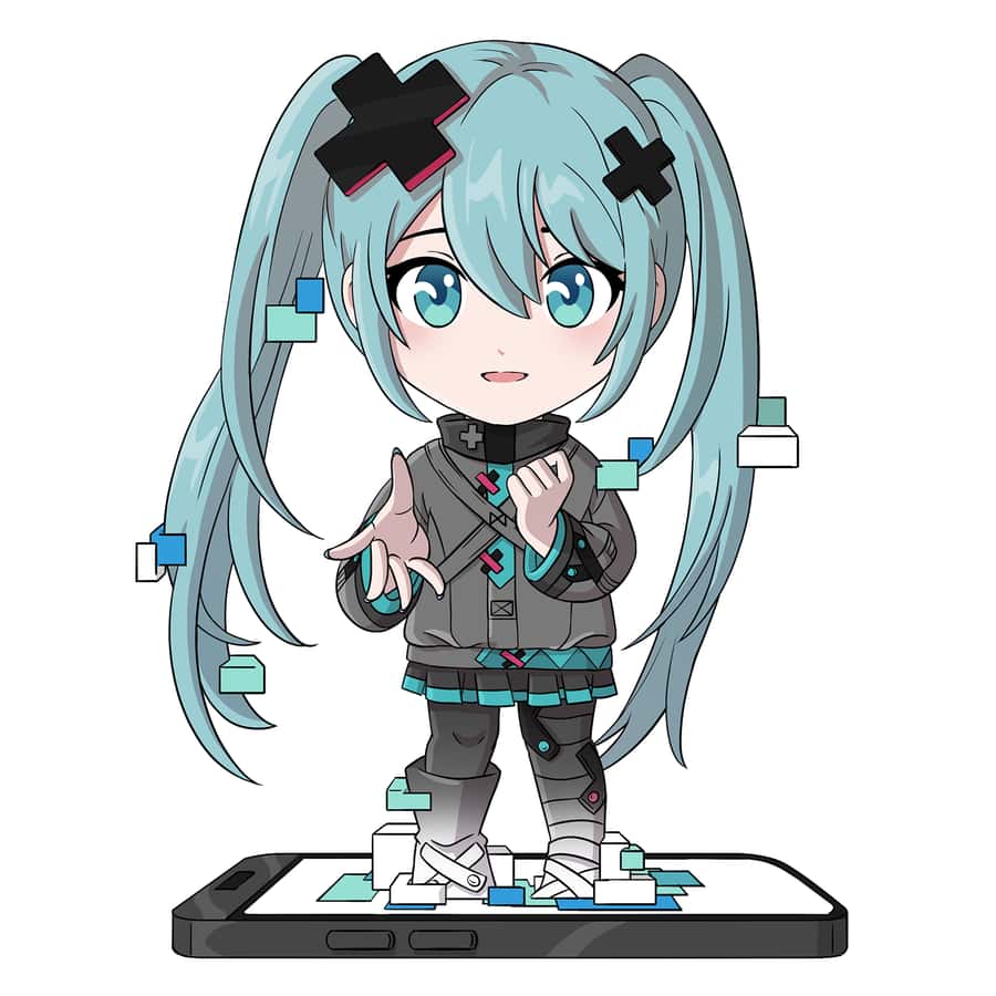 Wait, what do you mean she can’t sing?! Standing atop a white and blue phone screen as digital cubes wrap around her body, Miku holds an open hand forward with bright blue eyes staring out from her blushing face that’s framed by pale bangs and ponytails as she wears a grey jacket over a blue and black pleated skirt.